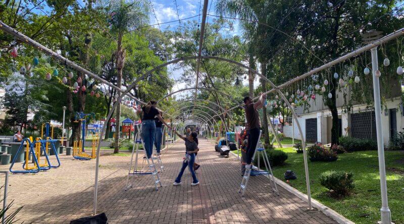 A Prefeitura de Xanxerê iniciou, nesta quarta-feira (18), a decoração alusiva à Páscoa de 2026. A Praça Tiradentes receberá mais de cinco mil ovos coloridos, além de diversos elementos que remetem à data celebrativa.